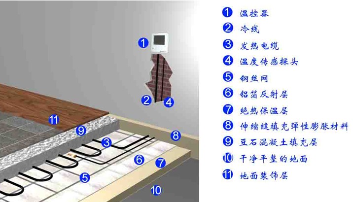 注意事项:发热线部分,须铺设在地面绝热层上部,不允许相互搭线,发热电缆不允许凹进苯板中,冷热线接头处有明确标识(见产品说明)。